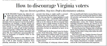 "For decades Virginia has allowed residents who lack proof of identification or whose IDs have been lost or stolen to vote, provided they are listed in the voting rolls and sign sworn statements attesting to their identities. Now, in response to no known problem, Republicans are backing a change... that would allow such citizens to cast only provisional ballots, which would be counted only if their identities were subsequently verified with IDs," the Post noted.