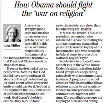 In "How Obama should fight the ‘war on religion,’" Post religion correspondent Lisa Miller waited all of two paragraphs to mock the Catholic Church. "It seems far-fetched, from my perspective, to think that God should have any opinion at all about contraceptive technology, let alone about which corporate entity should pay for it," Miller snarked. "Yet that is the argument the U.S. Conference of Catholic Bishops made last week. God doesn’t like birth control, they said. To force Catholic organizations to pay for birth control goes against God and so against the consciences of right-minded Catholics who believe in God."