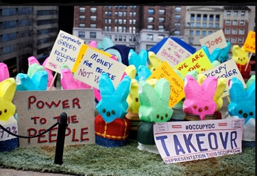 This time, the Post fondly remembered the left-wing squatters' camp by awarding its sixth annual Easter Peeps Diorama Contest to Cori E. Wright of Falls Church, Va., for her "OccuPeep D.C." display. Wright, a decorative painter who works for the Architect of the Capitol told the Post that she "[doesn't] necessarily agree with the occupiers, but I agree with the right to occupy." [see photo of diorama below page break]