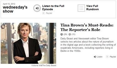 Appearing on the April 16 "Morning Edition" to discuss what NPR tagged as "the contributions of journalists to global culture," Newsweek/Daily Beast editor Tina Brown worked in a gratuitously crude and error-laden slam of the late "right-wing radical blogger" Andrew Breitbart, who, Brown reminds us "dropped dead in [his] early 40s."