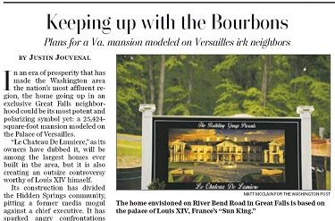 So what actually made today's Post front page? Among other things, a highly parochial story about a lawsuit pitting neighbors against each other in a wealthy Northern Virginia community. "Plans for a Va. mansion modeled on Versailles irk neighbors," read the subheadline for Post staffer Justin Jouvenal's 30-paragraph story. Why on Earth is this worthy of front-page space? You have to wait until paragraph 14, when Jouvenal discloses that a former media executive is one of those filing the lawsuit against his neighbor, Young Yi: