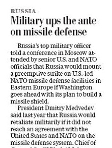 "Russia's top military officer told a conference in Moscow attended by senior U.S. and NATO officials that Russia would mount a preemptive strike on U.S.-led NATO missile defense facilities in Eastern Europe if Washington goes ahead with its plan to build a missile shield," the Associated Press has reported.