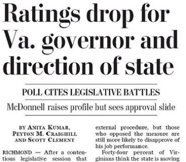 "The approval rating for McDonnell (R) dropped six points over the past year, from 62 percent to 56 percent. Thirty-five percent disapprove of the job he is doing — a nine-point increase from a year ago," staff writer Anita Kumar noted.