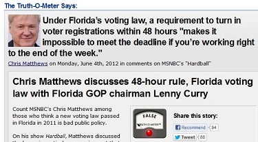Of course you probably won't hear an apology or retraction on the network's programming, but PolitiFact.com has determined that MSNBC's Chris Matthews was in error when the Hardball host claimed on his June 4 program that a new Florida law -- which has been on hold by a federal judge -- made it utterly impossible for voter registration drives to sign up new voters over weekends. The law requires voter registration drive volunteers to turn in new voter registration forms within 48 hours after having collected them. "You don’t have to be a lawyer to own a calendar or know what a weekend is. A weekend is 48 hours," Matthews sneered at Florida GOP chairman Lenny Curry, insisting that its impossible to register new voters over a weekend without running afoul of the law