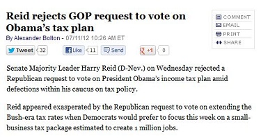 "Senate Majority Leader Harry Reid (D-Nev.) on Wednesday rejected a Republican request to vote on President Obama’s income tax plan amid defections within his caucus on tax policy," Alexander Bolton of The Hill newspaper reported just before 10:30 a.m. today. "Reid appeared exasperated by the Republican request to vote on extending the Bush-era tax rates when Democrats would prefer to focus this week on a small-business tax package estimated to create 1 million jobs," Bolton added.
