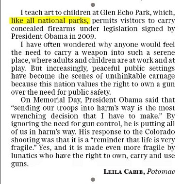 "I teach art to children at Glen Echo Park, which, like all national parks [emphasis mine], permits visitors to carry concealed firearms under legislation signed by President Obama in 2009," Leila Cabib of Potomac, Md., lamented. "[I]ncreasingly, peaceful public settings have become the scenes of unthinkable carnage because this nation values the right to own a gun over the need for public safety," she added, later insisted that Obama is "putting all of us in harm's way" by "ignoring the need for gun control."