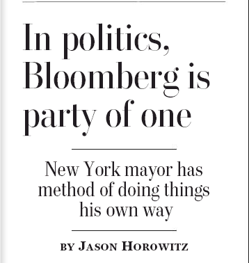 That's the impression that Washington Post writer Jason Horowitz attempted to give readers in his 20-paragraph Style section puff piece in today's paper entitled, "In politics, Bloomberg is party of one."