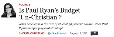 Jesus Christ would favor a tax rate as little as 50 percent and as high as 100 percent. So really, President Obama's preferred tax rates are a bargain. That's one of the big "idea" of Erika Christakis's August 14 Time magazine Ideas blog post, "Is Paul Ryan's Budget 'Un-Christian'?"
