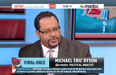 It was the "demonization of a predictable minority," in this case Muslims, that was the spark that light the conflagration, Dyson argued on the September 14 edition of the noon Eastern program Now with Alex Wagner. "It's not as if, oh in America, we've resolved this with equanimity and grace," he added, seeking to conflate isolated incidents of hate speech against Muslims inside the United States with the violent response of the Arab street to an obscure low-budget YouTube video. [MP3 audio here; video follows page break]