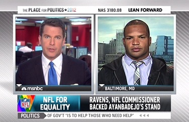 Openly gay and outspoken same-sex marriage advocate Thomas Roberts today devoted a segment of his MSNBC program to a pre-recorded interview with Ravens linebacker Brendon Ayanbadejo, who is publicly supportive of a new Maryland law legalizing same-sex marriage. Yet nowhere in that interview did Roberts mention that it was a Democratic state delegate who tried to silence Ayanbadejo.