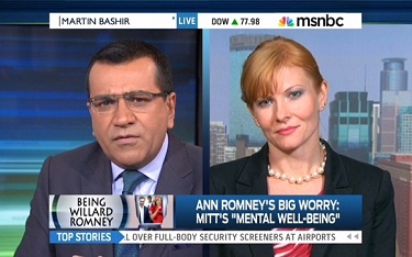 Obviously, in context, she was not suggesting her husband couldn't handle stress well, just that she knows the presidency is a stressful job and would be emotionally taxing on the man she loves. But to MSNBC's Martin Bashir, it was an opportunity to run a segment on his October 1 program where he strongly suggested that Romney may not be mentally fit for duty as president. [MP3 audio here; video embedded at bottom of post]
