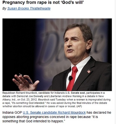 Indiana GOP U.S. Senate candidate Richard Mourdock has declared he opposes aborting pregnancies conceived in rape because “it is something that God intended to happen.”
