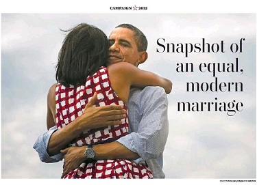 "Snapshot of an equal, modern marriage," gushes the headline. "Loving image of Obamas is embraced by social media," added a subheader for Philip Kennicott's "Critic's Notebook" feature. "Who is embracing whom in that photograph of the Obamas that went viral on election night?" Kennicott asked in his lead sentence, laying the groundwork for a gushy item on how the Obamas exemplify a perfectly equal marital union, unlike, apparently, stodgy traditionalist, Republican first couples of yore (emphasis mine):
