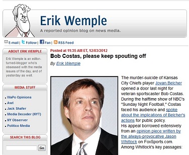 Washington Post media blogger Erik Wemple jumped to the defense of Bob Costas in a Monday morning blog post entitled, "Bob Costas, please keep spouting off." While Wemple avoided stating whether he agreed with Costas and Fox Sports columnist Jason Whitlock on gun control per se, he made it perfectly clear he had a low view of the average Joe at home wanting to escape the world for three hours watching a football game.