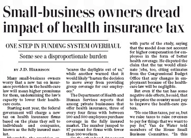 "Many small-business owners worry that a new tax on insurance providers in the health-care law will mean higher premiums for them, undermining the law's capacity to lower their health-care costs," Washington Post staff writer J.D. Harrison opened his 15-paragraph May 13 story, "Small-business owners dread impact of health insurance tax." The website headline was even starker: "Health insurance tax ‘scares the daylights’ out of some small-business owners."