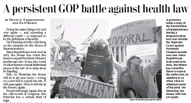 That, essentially, was the complaint waged by Washington Post reporters David A. Fahrenthold and Ed O'Keefe in the first six paragraphs of their page A2 May 16 story, "A persistent GOP battle against health law":