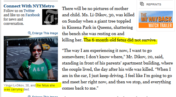 Our friend Steve Ertelt over at LifeNews.com caught the New York Times in an incredible display of cold-hearted clinical language in service of political correctness. The occasion was an incredibly heartbreaking story of a 30-year-old New York woman who was killed when a tree fell on the park bench on which she was sitting. The woman, Yingyi Li-Dikov, was six months pregnant with a baby girl who also perished in the accident.