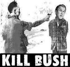 A protest sign depicting the severed head of George W. Bush dripping blood. A photoshop of the infamous photo of South Vietnamese General Nguyen Ngoc Loan executing a Vietcong officer with President Bush's head photoshopped on the victim's body and "Kill Bush" as the caption.