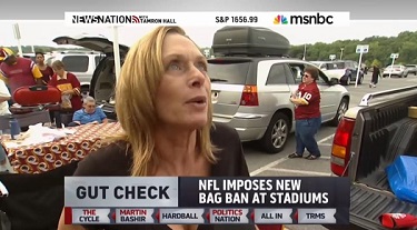 Leave it to the Lean Forward network to weave a war-on-women theme into just about anything. Today the network's Tamron Hall and Janet Shamlian hinted sexism was in play with a new NFL ban on large bans in stadiums. The move, they complained, disproportionately affected female football fans who might set out for the big game with a large bag or purse.