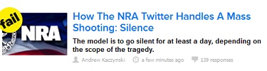 Prominently displayed on the BuzzFeed front page as I write this (3:00 p.m. Eastern) is a headline blaring "How The NRA Twitter Handles A Mass Shooting: Silence." The accompanying thumbnail shows the NRA's initials overlaid on an American flag, with the word "fail" in a yellow dot on the upper left-hand corner. "The model is to go silent for at least a day, depending on the scope of the tragedy," notes the subheadline.