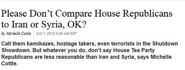 From Cottle's October 1 piece, "Please Don’t Compare House Republicans to Iran or Syria, OK?" (emphasis mine):