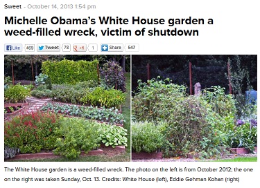 Ever eager to dutifully further White House spin, veteran Obama apologist Lynn Sweet hacked out a blog post this afternoon lamenting that "Michelle Obama’s White House garden [is] a weed-filled wreck, victim of shutdown."