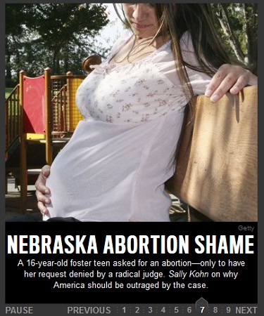 Daily Beast editors highlighted Kohn's rant, placing it in the number 7 slot in the lightbox this morning. "A 16-year-old foster teen asked for an abortion-- only to have her request denied by a radical judge," complained a teaser caption on the Beast's front page, adding that Kohn explains "why America should be outraged by the case." Kohn began: