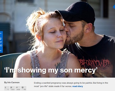 In a gauzy piece meant to bash the pro-life conservatism of Oklahoma's abortion laws, Carmon highlighted the plight of Jessica and Erick Davis -- an Oklahoma couple with three children -- and their journey earlier this year to a Dallas, Texas, clinic to take the life of their fourth son, an unborn child diagnosed with a severe brain malformation. The Davises are apparently unrepentant about the decision and even excuse it as an act of mercy. Indeed, the Davises were offended that local funeral homes refused their request to bury the unborn child they had legally murdered -- but for whom they went to name on a death certificate: