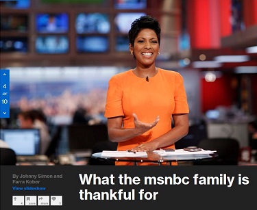 Leave it to MSNBC to see Thanksgiving as a time to be thankful for ObamaCare, Wendy Davis, same-sex marriage, and John Kerry hammering out an interim nuclear deal with Iran.