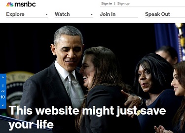 Well now the landing page for the Lean Forward network is hailing HealthCare.gov as the "website [which] might just save your life." The teaser headline links to msnbc.com staffer Aliyah Frumin's gauzy treatment of President Obama's latest speech plugging his troubled health care overhaul (emphasis mine; see screen capture below page break):