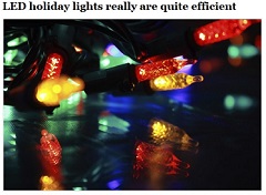 It’s hard to say how much embedded energy is in a strand of Christmas lights. However, since the lights will last 40 or 50 years, that embedded energy comes very close to zero on a yearly average. The only energy we have to attribute to the lights is the electricity, which, for a strand of larger LEDs, is 2.5 watts. If you run them four hours per day for 30 days, that means 0.3 kilowatt-hours over the course of a season. According to EPA conversion data, generating that much electricity would emit 0.44 pounds of greenhouse gas equivalents. (A carbon dioxide equivalent is all the greenhouse gases emitted, expressed in terms of the global warming potential of carbon dioxide.)
