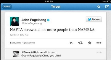 Updated (15:25 EST): Fugelsang testily tweeted, "Hey, I deleted a NAFTA joke earlier cos someone politely asked me. Cue the jackal child-men of Newsbusters. NAFTA hurt them, too." To that, @bfinstock quipped in reply, "Probably best to keep 'child-men' out of a tweet in which you are describing the deletion of a 'NAMBLA' joke." | "NAFTA screwed a lot more people than NAMBLA," left-wing comedian and frequent cable news pundit John Fugelsang tweeted this morning.