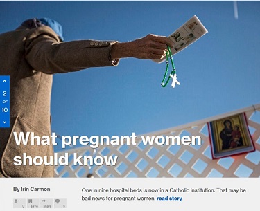 "One in nine hospital beds is now in a Catholic institution. That may be bad news for pregnant women," reads the caption on the front-page tease for a December 19 Irin Carmon story, "What Catholic hospital expansion means for women," wherein the abortion-rights absolutist turns the network's "war on women" artillery on Church-run hospitals. Here's how Carmon opened her story (emphasis mine):