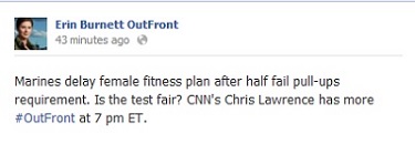 "Marines delay female fitness plan after half fail pull-ups requirement. Is the test fair?" That's how the Facebook page for CNN's Erin Burnett OutFront teased a story on the topic to air on Friday's 7 p.m. Eastern program. [see screen capture below page break]
