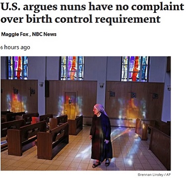 Look no further than NBCNews.com's Maggie Fox and her January 3 article, "U.S. argues nuns have no complaint over birth control requirement" (emphasis mine):