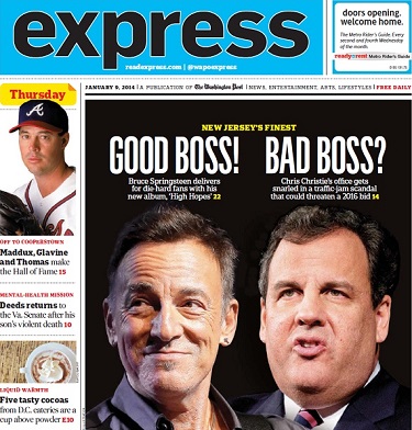 Not to be outdone, the Post-owned tabloid Express contrasted "Bad Boss?" Christie with "Good Boss!" Bruce Springsteen on their January 9 edition [see image below page break]