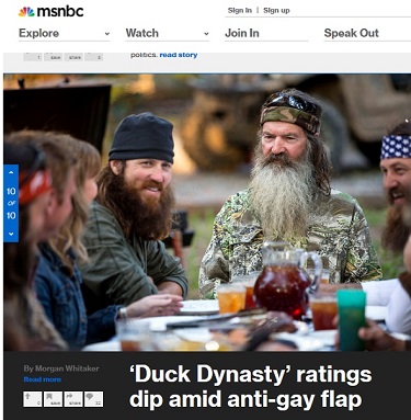 "'Duck Dynasty' ratings dip amid anti-gay flap," thundered the teaser headline on the msnbc.com landing page. Clicking the link brings the reader to Morgan Whitaker's January 17 article, "‘Duck Dynasty’ sees ratings drop in season premiere," which begins (emphasis mine):