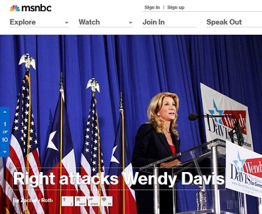 "Right attacks Wendy Davis," screams the top msnbc.com headline this afternoon. Clicking that teaser headline takes the reader to Zachary Roth's "Right pounces on news that Wendy Davis embellished life story." Roth went on to practically script a melodrama where Davis is the damsel in distress tied to the railroad tracks by those dastardly, vile Texas Republicans (emphasis mine):