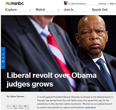 "Liberal revolt over Obama judges grows," blares the teaser headline over a photo of a stern-looking Rep. John Lewis (D-Ga.). "A revolt against President Barack Obama’s nominees to the federal bench in Georgia has spread from the civil rights icons who paved the way for his presidency to the abortion rights movement," adds a teaser caption [see screen capture below page break], alarming readers that, in the words of NARAL president Ilyse Hogue, “We look to our judicial branch to protect and uphold our values and freedoms." Here's how writer Adam Serwer caught msnbc.com readers up to speed on the controversy [emphasis mine]: