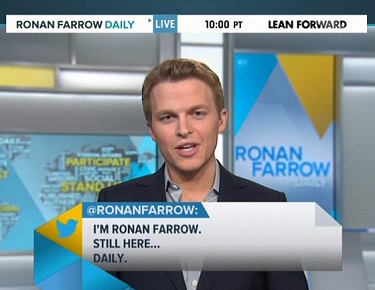 October 2013: MSNBC announces Farrow’s new show. Network president Phil Griffin calls it a “game-changer,” and says what we already know: “Ronan has packed more experience in his 25 years of life than most people have in a lifetime.”