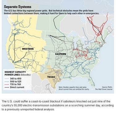 "The U.S. could suffer a coast-to-coast blackout if saboteurs knocked out just nine of the country's 55,000 electric-transmission substations on a scorching summer day, according to a previously unreported federal analysis," the Wall Street Journal's Rebecca Smith reported on the front page of Thursday's paper. A set of "coordinated attacks in each of the nations' three separate electric systems could cause the entire power network to collapse," Smith noted, citing "people familiar with the [Federal Energy Regulatory Commission] research."