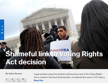 "Shameful link in Voting Rights Act decision," blared the teaser headline in the lightbox at msnbc.com. "Legal scholars argue the decision striking down part of the Voting Rights Act is rooted in the Dred Scott decision, considered the worst in U.S. history," noted the photo caption [see screen capture at bottom of post]