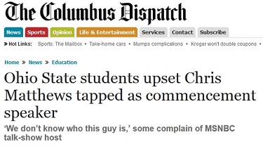 Ohio State University seniors are none too pleased to be having Chris Matthews as their commencement speaker, and it's not simply a question of politics, reports Collin Binkley of the Columbus Dispatch.