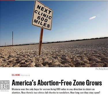 "There is a nearly 1,200-mile-wide desert of abortion providers stretching from the western boarder of Idaho to the eastern boarders of North and South Dakota," the Daily Beast's Robin Marty whines in her April 14 story, "America's Abortion-Free Zone Grows," adding that:
