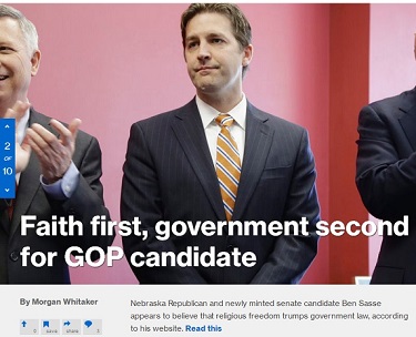 Nebraska Republican and newly minted Senate candidate Ben Sasse appears to believe that religious freedom trumps government law, according to text on his website highlighted Wednesday by Think Progress.