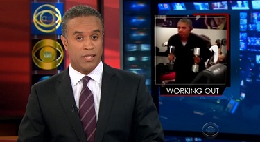 MAURICE DuBOIS, substitute anchor [this immediately followed a story about Triple Crown contender California Chrome]: Well, we got a rare look today at another athlete going through his paces. This video leaked out of Barack Obama exercising his presidential powers in a hotel gym in Warsaw. Fighting off fatigue, the man who carries the weight of the world on his shoulders stays in shape by hoisting dumb bells over his head over his head, and he got in some cardio, too, on an elliptical trainer.