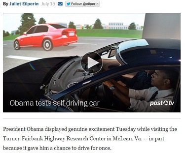 On page A7 of the July 16 paper, Washington Post staff writer Juliet Eilperin hacked out 12 paragraphs of goo over President Obama's Tuesday visit to the Turner-Fairbank Highway Research Center in McLean, Va., where he "[made] a case for pouring more federal funds in U.S. infrastructure" and also got behind the wheel of "a self-driving car stationed at a simulator." "Man, this is so exciting.... I haven't been on the road in a long time," Eilperin quoted the president, who added a 1980s pop-culture reference. "It was sort of like 'Knight Rider,' Eilperin quoted Obama, noting that it "[prompted] laughter from a crowd of nearly 200 of the center's employees."