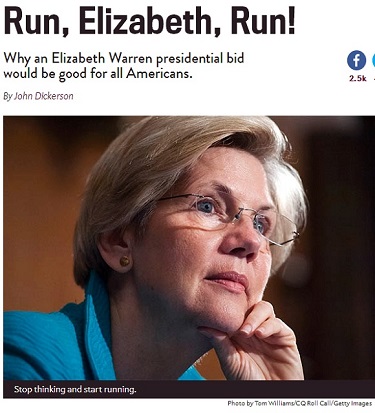Worrying that "the Democratic contest looks like it will be a foggy, repetitive march toward Hillary Clinton" and that there needs to be a primary challenger from Hillary Clinton's left to "energize the Democratic Party’s liberal base," CBS political director John Dickerson pounded out a July 17 piece at Slate.com urging the Bay State's senior senator,  "Run, Elizabeth, Run!" "Stop thinking and start running," urges a caption under a photograph of a pensive-looking Sen. Elizabeth Warren (D-Mass.)