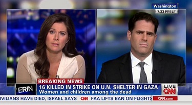 "I think it would be a disservice to your viewers for a [CNN] reporter from Gaza not to mention that in the last week we had two different UNRWA [United Nations Relief and Rehabilitation Administration Works Agency] schools where we had actually rockets found in the schools and handed over to Hamas," Dermer chided host Erin Burnett, who interrupted, "These are two different UN schools, you're saying." "That's correct," the ambassador replied, continuing his attack on the network's bias with a suggestion that the network was not properly doing its homework on the conflict (emphasis mine; watch video below page break):