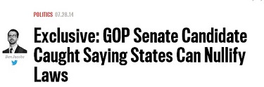 Joni Ernst, the Republican nominee for U.S. Senate in Iowa, appears to believe states can nullify federal laws. In a video obtained by The Daily Beast, Ernst said on September 13, 2013 at a form held by the Iowa Faith & Freedom Coalition that Congress should not pass any laws “that the states would consider nullifying.”